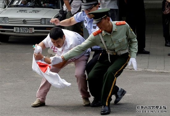 爱国人士在日本驻华大使馆前想要焚烧一面日本国旗并举行抗议活动。