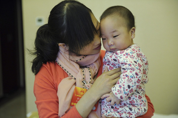 3月3日上午,北京人大会议中心宾馆,来自安徽宿州农村的十二届全国人大一次会议代表彭伟平和丈夫在照料孩子。
