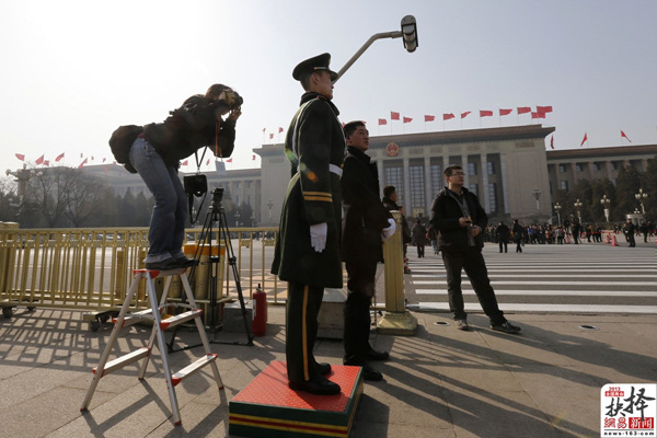 2013年两会于3月正式在京召开。新闻记者为捕捉会议瞬间、抢发新闻稿件,往往要使出浑身解数,聚焦现场,实时传送两会近况。图为3月2日,报道两会的摄影记者站在梯子上拍摄。