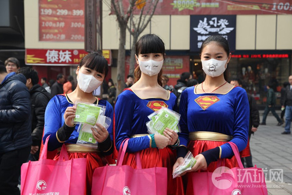 华都微公益女超人沿街送口罩(1)(2)
