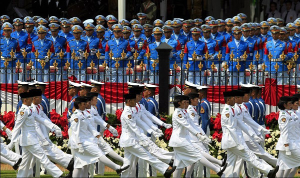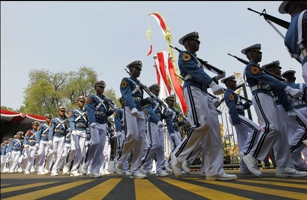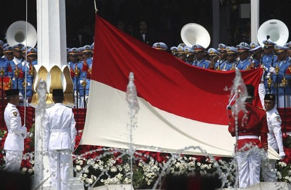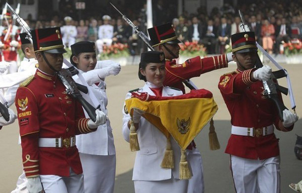 2012年8月17日,是印度尼西亚第67个独立日。当天,印度尼西亚在雅加达举行了盛大的阅兵式。图为升旗队列在行进。
