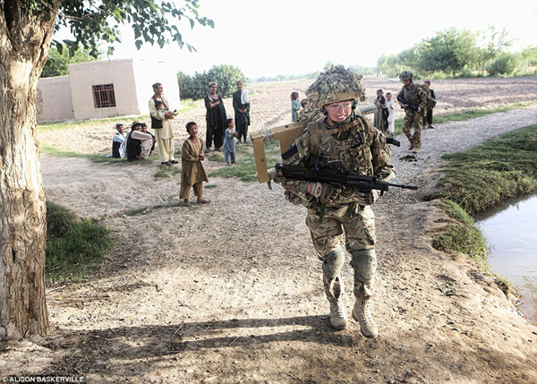 图为女兵Lieutenant Jessica French在赫尔曼德省的一个村庄附近巡逻